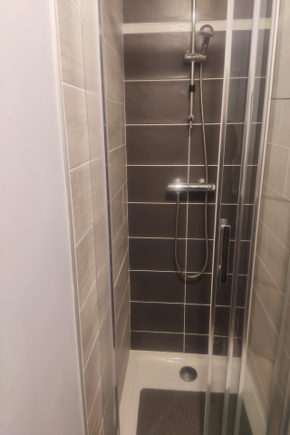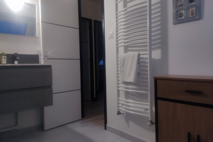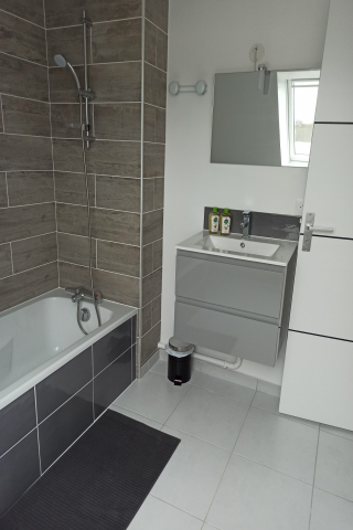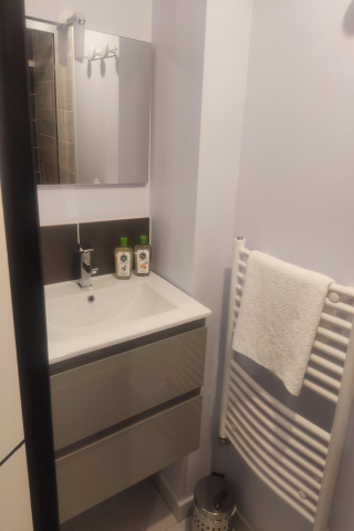 1 chambre avec lit double, salle d’eau attenante (douche, vasque, sèche-serviettes, sèche-cheveux)