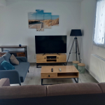 Salon chaleureux avec canapé, TV, prises USB/Ethernet